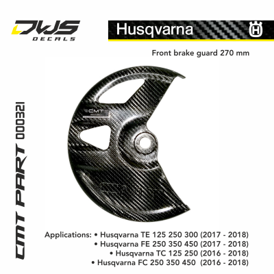 Husqvarna CMT carbonnen remschijf beschermer 270 mm carbon front brake guard 270 mm carbon parts dws decals Applications: TC 125/250 2015 FC 250/350/450 2015 TE 125/250/300 2014 2015 2016 FE 250/350/450 2014 2015 2016
