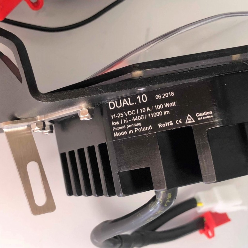 In the DUAL.10 light we obtained the ability to generate two beams of light with different incidence angles simultaneously from one light. Thanks to this solution, we obtain diffused light (FLOOD) in LOW mode and long-range light (SPOT) in HI mode from one DUAL.10 reflector. Thanks to appropriately selected angles of incidence of light, the DUAL.10 light in the LOW - 4400 lm 48W mode lights the turns and allows driving in the fog while not dazzling oncoming vehicles. HI mode - 11000 m 100W supports road lights of the motorcycle shining far ahead of the vehicle while illuminating the corners.